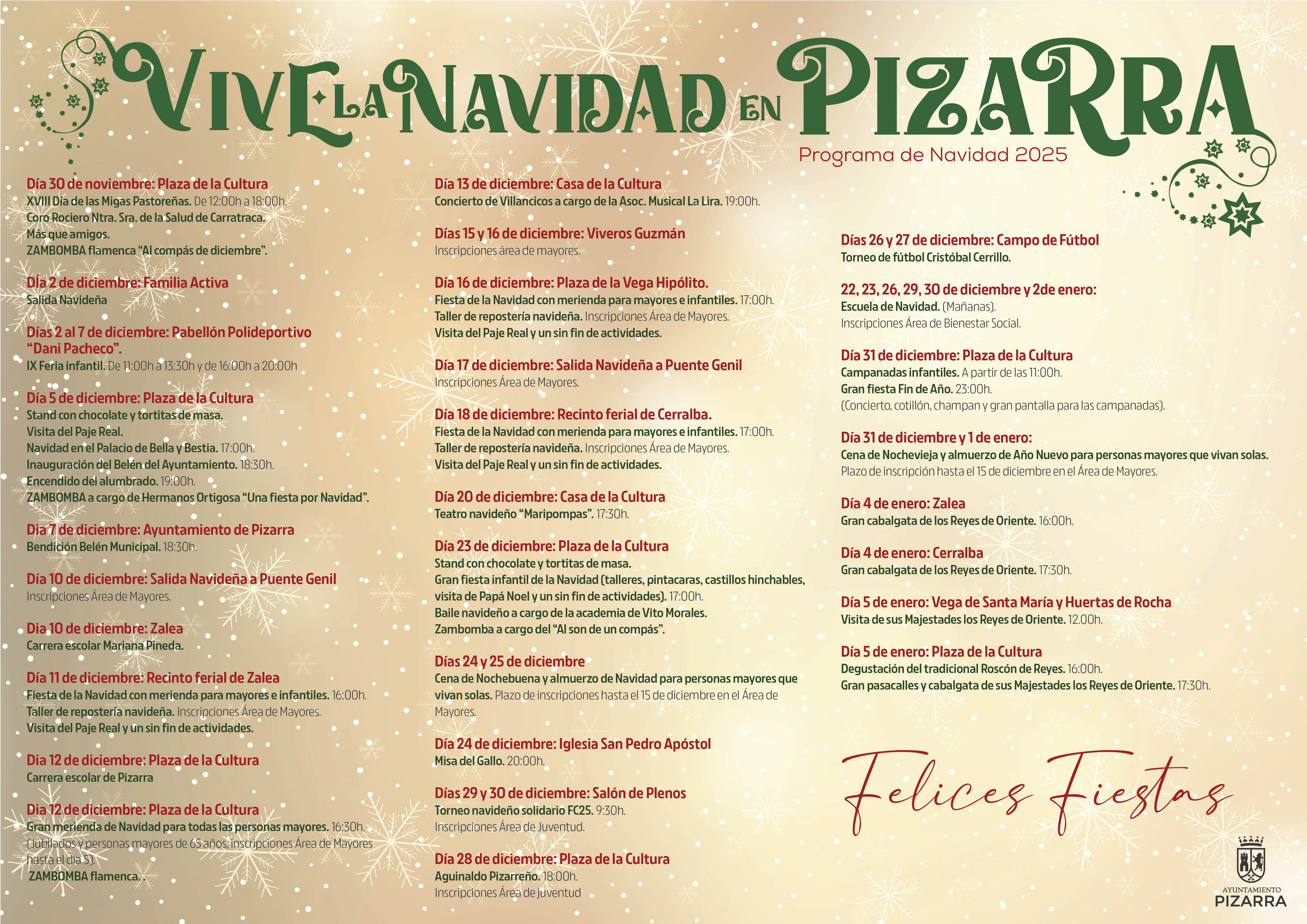 El Área de Fiestas y Tradiciones de Pizarra, dirigido por el concejal Joaquín Martín, ha presentado ya la amplia programación prevista para esta Navidad, en la que hay actividades para el público de todos los gustos y edades. Las fiestas se inaugurarán de forma oficial el 5 de diciembre en la plaza de la cultura. La amplia programación prevista es la siguiente:
